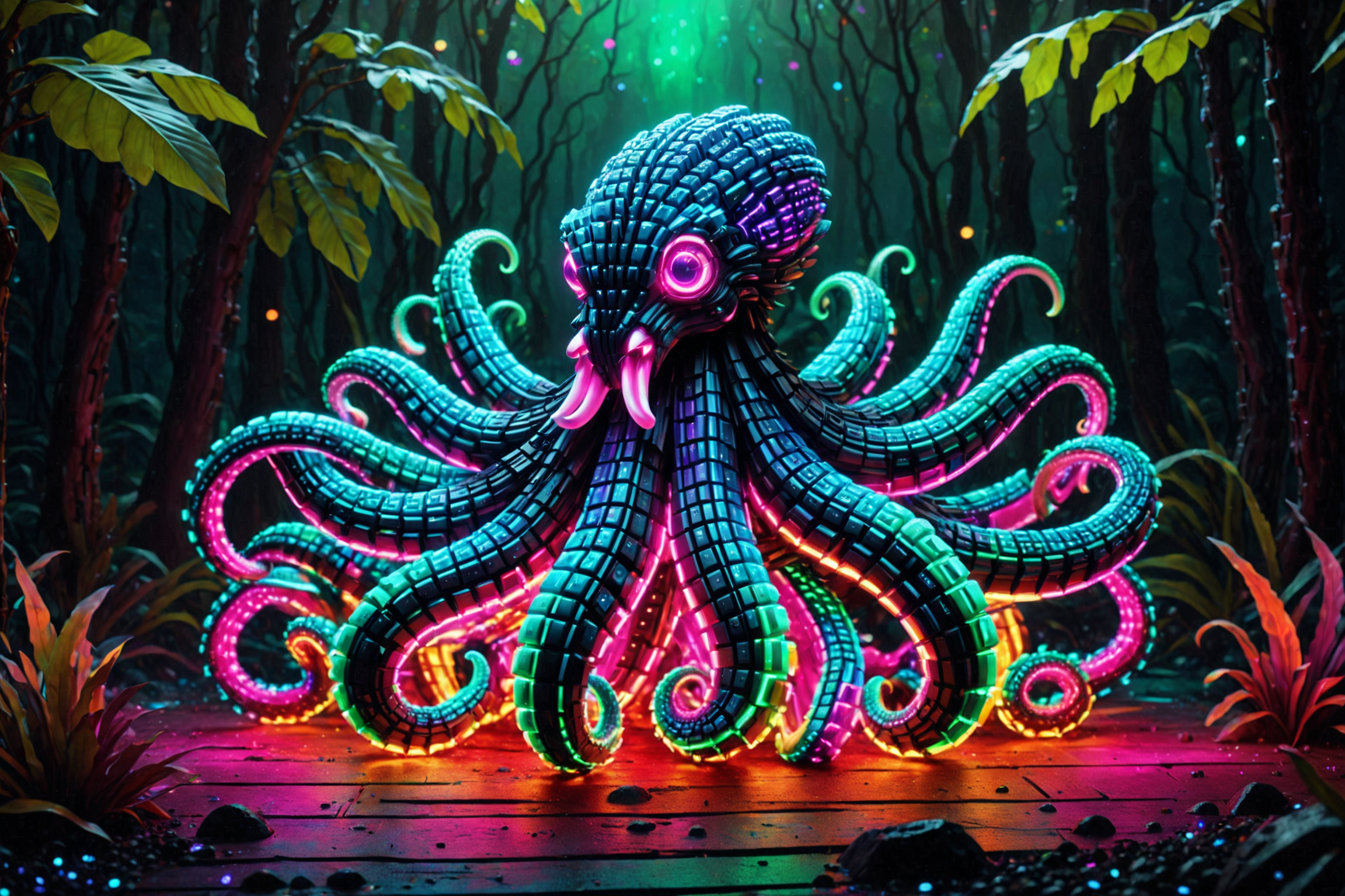 sexy an RGB kraken made out of RGB Keyboards, with glowing tentacles, deep-sea eyes, solo, with purple galaxy RGB lights, cosmic and dreamy, a digital enchanted forest with neon trees, RGB fireflies, glowing paths, detailed background, breathing RGB flames, glowing with RGB lights, mystical, shimmering with RGB lights, action focus, medium shot, a neon light battle with creatures clashing, RGB energy bursts, glowing arena, a glowing digital flame with RGB lights, nearby, a digital aurora with RGB lights in waves, cosmic glow, best quality, vibrant colors, photorealistic style, high detail, high-definition, hyper-realistic, extremely high-resolution details, fine texture, incredibly lifelike, realistic, not cartoon, not drawing, highres, 4K resolution, source photo, realistic photo, masterpiece, best quality, amazing quality, very aesthetic, ultra-detailed, detailed textures, natural lighting, soft lighting, electric neon colors, bright pinks, purples, cyans, electric spark, sharp and vibrant, medium shot, <lora:RGB_Keyboard_themed-000008:1>