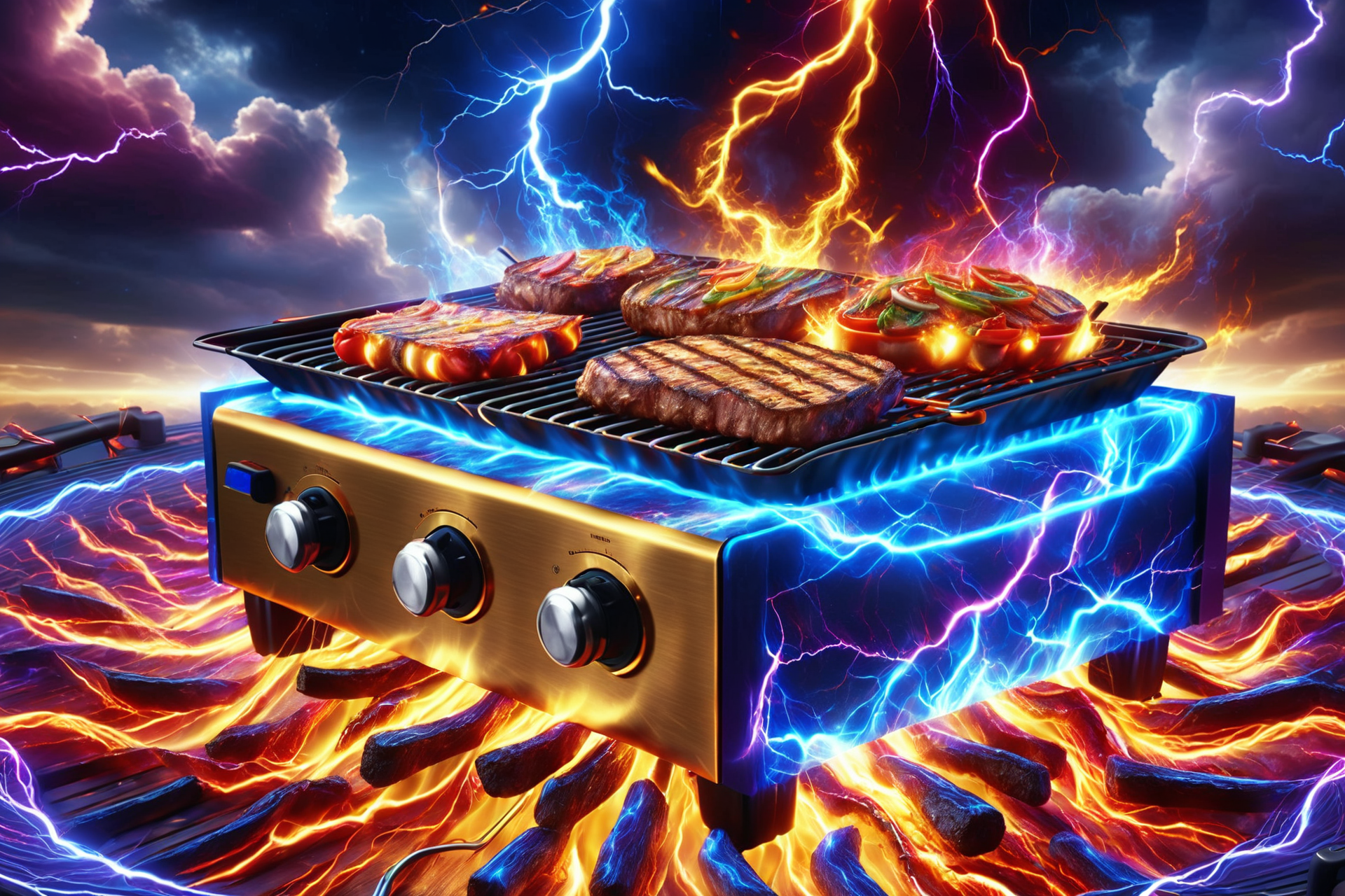 electric grill with sizzling plates made of red and purple lightning thunder trails lthndrtrl, cosmic void, stormy sky background, best quality, vibrant colors, realistic style, high detail, hyper-realistic, highres, 4K resolution, realistic photo, masterpiece, ultra-detailed, lthndrtrl, golden blue tones, warm light, close-up shot, <lora:lightning_thunder_V1.1:0.7>