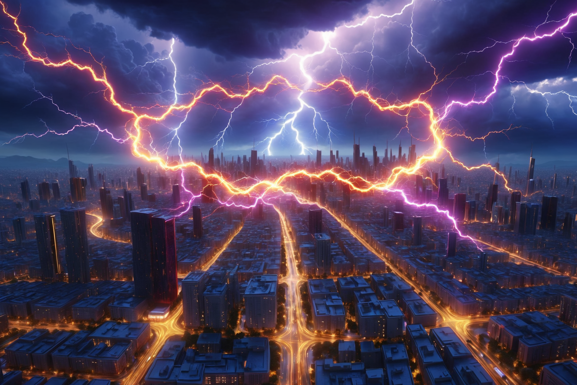 thunder bracelet, made of golden and red lightning thunder trails, lthndrtrl, futuristic city, stormy sky background, best quality, vibrant colors, realistic style, high detail, hyper-realistic, highres, 4K resolution, realistic photo, masterpiece, ultra-detailed, lthndrtrl, purple blue tones, thunder pulse, close-up shot, <lora:lightning_thunder_V1.1:0.3>