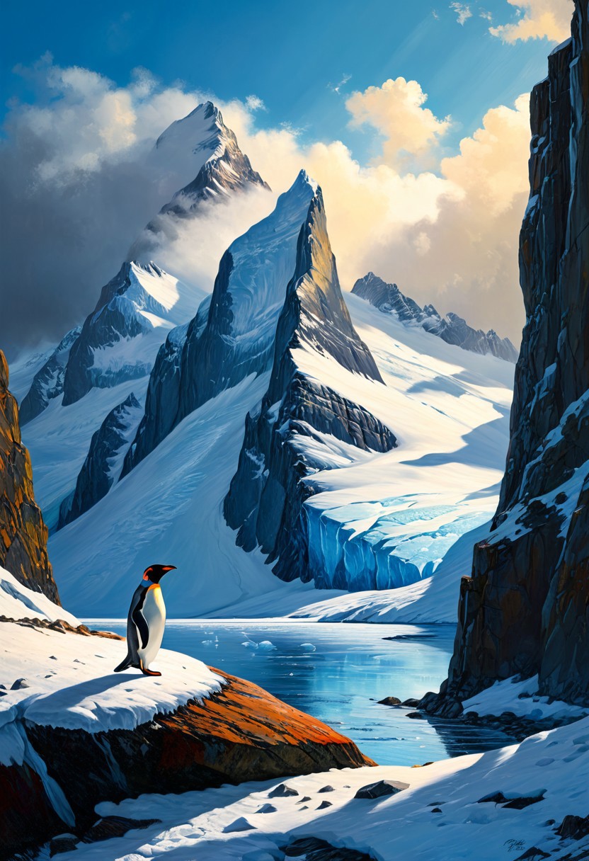 (highly detailed), (hyper realistic), photographic, soft blur, focus:(oil painting:1.5), (artist:Albert Bierstadt), (long view:1.3), (penguin:2), (rocky boulder:1.5), (edge of a cliff:1.7), (majestic:1.5), (powerful:1.8), (sleek:1.3), (dusky lighting:1.6), (shadow depth:1.4), (Antarctic mountains:1.5), (snow-covered ridges:1.3), (white fluffy clouds:1.4), (cold blue sky:1.2), (western art style coloring:1.6), (rich earthy tones:1.4), (vibrant contrasts:1.5), (glacial terrain:1.2), (icy landscape:1.3), (light and shadow interplay:1.7), (atmospheric:1.5), (moody:1.6), (cinematic:1.8), (painterly brushstrokes:1.4), (texture:1.3), (realism:1.5), (grand composition:1.6), close-up image --ar 16:9 --v 5.2 --q 2